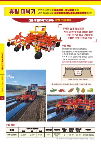 %ub300%ud48d %ud734%ub9bd%ud53c%ubcf5%uae30(2%ub450%ub451) DPM-2200MS65~80cm2030cm~45~50 cm 65~80cm%ub450%ub451%ud3ed, %uc774%ub791%uae4a%uc774 %uc870%uc808%uc774 %uc790%uc720%ub86d%ub2e4.- 2%ub450%ub451(%ud3c9%ub450%ub451), %ud2b8%ub799%ud130 80%ub9c8%ub825%uae09 %uc774%uc0c1- %uc2b5%ud55c %ud1a0%uc9c8%uc5d0%uc11c%ub3c4 %ub450%ub451%ud615%uc131 %ubc0f %ube44%ub2d0%ud53c%ubcf5%uc774 %ud0c1%uc6d4- %uc190%uc815%uc2dd %ubc0f %uae30%uacc4%uc815%uc2dd%uc774 %uac00%ub2a5%ud55c %ud734%ub9bd%ubcf5%ud1a0%uae30!- %ub450%ub451 %ud3ed 65cm~80cm, %uc774%ub791 %uae4a%uc774 20~30cm, %uace0%ub791 %ud3ed 45~50cm%uae4c%uc9c0 %uc870%uc808 %uac00%ub2a5- %uc904%uce58%uae30 %ub9c8%ucee4%ub97c %uc774%uc6a9%ud558%uc5ec %uc815%uad50%ud55c %uc791%uc5c5%uac00%ub2a5(%uc635%uc158)%uc8fc%uc694 %ud2b9%uc9d5%u203b %ubcf8 %uce74%ub2e4%ub85d %uc81c%ud488 %ubc0f %uc0ac%uc591%uc740 %ud488%uc9c8 %ud5a5%uc0c1%uc744 %uc704%ud558%uc5ec %uc608%uace0%uc5c6%uc774 %ubcc0%uacbd %ub420 %uc218 %uc788%uc2b5%ub2c8%ub2e4.%ud615%uc2dd%uba85%uae30%uccb4%uc758 %ud06c%uae30(mm) %uc801%uc6a9%ub9c8%ub825 %ub450%ub451 %uc218 (%uac1c)%ub450%ub451 %ud3ed (cm)%ub450%ub451%ub192%uc774 (cm) %uc911%ub7c9(kg) %uad6c%ub3d9%ubc29%uc2dd%uae38%uc774 %ud3ed %ub192%uc774%uce21%uba74%uccb4%uc778 %uad6c%ub3d9%ubc29%uc2dd%uc8fc%uc694 %uc81c%uc6d0DPM-2200MS 2,820 2,700 1,430 80HP%uae09%uc774%uc0c1 1074 2 65~80 20~30 %ucf69,%uace0%uad6c%ub9c8,%uace0%ucd94,%uac10%uc790,%ubc30%ucd94,%uc625%uc218%uc218,%uc870%ub4f1 %ub2e4%uc591%ud55c %uc791%ubb3c %uac00%ub2a5%ud48d%uc694%ub85c%uc6b4 %uc218%ud655%uc758 %uae30%uc068 %ub300%ud48d%ub18d%uae30/%ub300%ud48d%uae30%uacc4(%uc8fc)%uc77c%ub418%ub294%uc791%uc5c5%uae30%ub294%ub2e4%ub974%ub2e4%u201c %ub450%ub451%uc774 %ub192%uac8c %ud615%uc131%ub418%uace0 %ub450%ub451 %uc911%uc559 %ubd80%uc704%uc5d0 %uaebc%uc9d0%uc774 %uc5c6%uc5b4 %uc791%ubb3c %ucc29%uadfc%uc774 %uc88b%uace0 %uade0%uc77c%ud558%uc5ec %uc218%uc6d4%ud55c %uc218%ud655 %uc791%uc5c5%uc774 %uac00%ub2a5%u201c%ud55c%ubc88%uc758 %uc791%uc5c5%uc73c%ub85c %ub450%ub451%uc131%ud615 + %ube44%ub2d0%ud53c%ubcf5 %uae4c%uc9c0 %uc2b5%ud55c %ud1a0%uc9c8%uc5d0%uc11c%ub3c4 %ub450%ub451%ud615%uc131 %ubc0f %ube44%ub2d0%ud53c%ubcf5 %uc131%ub2a5%uc774 %ud0c1%uc6d4%ud558%ub2e4!14