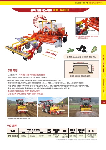 %ud48d%uc694%ub85c%uc6b4 %uc218%ud655%uc758 %uae30%uc068 %ub300%ud48d%ub18d%uae30/%ub300%ud48d%uae30%uacc4(%uc8fc)www.dp-mc.co.kr10~ 30cm100~130 cm%ub450%ub451%ud3ed, %uc774%ub791%uae4a%uc774 %uc870%uc808%uc774 %uc790%uc720%ub86d%ub2e4.%uc57d%uc81c%uc6a9%ub7c9260%u2113%ub3d9%ub825 %ud30c%uc885%uae30(%ub178%uc9c0%uc6a9) DPM-1400BJ1%ud615%uc2dd%uba85%uae30%uccb4%uc758 %ud06c%uae30 (mm) %uc801%uc6a9%ub9c8%ub825 (HP)%uc911%ub7c9(kg) %uaddc%uaca9 %ube44 %uace0 %ub450%ub451 %ud3ed (cm)%ub450%ub451 %ub192%uc774 (cm) 1%ub450%ub451(%ud3c9%ub450%ub451)%uae38%uc774 %ud3ed %ub192%uc774%ub450%ub451%uc131%ud615+%ud30c%uc885+%uc57d%uc81c%uc0b4%ud3ec%uc8fc%uc694 %uc81c%uc6d0DPM-1400BJ1 2,330 2,000 1,380 50HP%uae09 %uc774%uc0c1 730 100~130 10~30%u203b %ubcf8 %uce74%ub2e4%ub85d %uc81c%ud488 %ubc0f %uc0ac%uc591%uc740 %ud488%uc9c8 %ud5a5%uc0c1%uc744 %uc704%ud558%uc5ec %uc608%uace0%uc5c6%uc774 %ubcc0%uacbd %ub420 %uc218 %uc788%uc2b5%ub2c8%ub2e4.- %ud2b8%ub799%ud130 80%ub9c8%ub825 %uae09%ub300%uae4c%uc9c0 %uc0ac%uc6a9 %uac00%ub2a5- %ub178%uc9c0%uc6a9, 1%ub450%ub451 - %ub450%ub451%uc131%ud615+%ud30c%uc885+%uc57d%uc81c%uc0b4%ud3ec%ub97c %ub2e8 %ud55c%ubc88%uc5d0!- %uc88c%uc6b030cm%uae4c%uc9c0 %ud3b8%uc2ec %uac00%ub2a5%ud558%uc5ec %uc774%ub791%uac04%uaca9 %uc870%uc808%uc774 %uc790%uc720%ub86d%ub2e4.- %uc6d0%ud310 %ubc30%ud1a0%uae30%uc640 %uc7c1%uae30 %ubc30%ud1a0%uae30%ub97c %ubcf5%ud569%uc2dc%ucf1c %uc81c%uc791 %ud568%uc73c%ub85c%uc368 %ud2b8%ub799%ud130 %ubd80%ud558%ub97c %uac10%uc18c %uc2dc%ucf30%ub2e4.- %ud30c%uc885%uc2dc%uae30,%uae30%ud6c4%uc870%uac74,%uc7ac%ubc30%uc9c0(%ub17c,%ubc2d)%uc5d0 %ub530%ub77c %uc870%uac04%uac70%ub9ac (60cm ~100cm)%uc774%ub791 %uae4a%uc774(10cm~30cm)%uc870%uc808%uc774 %uc790%uc720%ub86d%ub2e4!- %ud30c%uc885 %uc7a5%uce58%ubd80%uac00 %ud0c8%ubd80%ucc29%uc2dd%uc774%ubbc0%ub85c %ud0c8%ucc29 %uc2dc %ub9c8%ub298,%uc591%ud30c(4%uc870, 6%uc870, 8%uc870) %ud734%ub9bd%ubcf5%ud1a0%uae30(%ub450%ub451%ud615%uc131+%uc57d%uc81c%uc0b4%ud3ec)%ub85c %ub2e4%uc591%ud558%uac8c %uc0ac%uc6a9.- %ud734%ub9bd %ubcf5%ud1a0%uae30%uac00 %uc77c%uc815%ud558%uac8c %ud759%uc744 %ubcf5%ud1a0%uc2dc%ud0a4%uace0 %uc131%ud615%ud310%uc774 %uace0%ub974%uac8c %ud759%uc744 %ub20c%ub7ec%uc90c%uc73c%ub85c%uc368 %uade0%uc77c%ud55c %ucc29%uadfc.- %uc904%uce58%uae30 %ub9c8%ucee4%ub97c %uc774%uc6a9%ud558%uc5ec %uc815%uad50%ud55c %uc791%uc5c5%uac00%ub2a5(%uc635%uc158)- %uc694%ub3d9 %ube0c%ub77c%ucf13 %ubd80%ucc29%uc73c%ub85c %ud68c%uc804 %uc791%uc5c5%uc2dc %ud30c%uc885%uae30 %ubd80%ud558 %uac10%uc18c%uc8fc%uc694 %ud2b9%uc9d5%ucf69,%ucc38%uae68,%uc625%uc218%uc218,%uc728%ubb34 %ub4f1 %ub2e4%uc591%ud55c %uc791%ubb3c %uac00%ub2a5%u203b %uc694%ub3d9 %ube0c%ub77c%ucf13 %ubd80%ucc29%uc73c%ub85c %ud68c%uc804 %uc791%uc5c5%uc2dc %ud30c%uc885%uae30 %ubd80%ud558 %uac10%uc18c%uc88c%uc6b0%ud68c%uc804%uac00%ub2a519