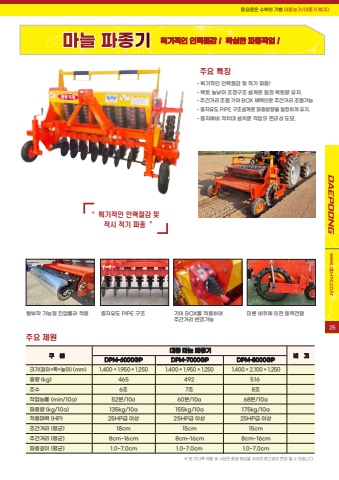 %ud48d%uc694%ub85c%uc6b4 %uc218%ud655%uc758 %uae30%uc068 %ub300%ud48d%ub18d%uae30/%ub300%ud48d%uae30%uacc4(%uc8fc)www.dp-mc.co.kr%ud68d%uae30%uc801%uc778 %uc778%ub825%uc808%uac10 ! %ud655%uc2e4%ud55c %ud30c%uc885%uc791%uc5c5 !%uc8fc%uc694 %uc81c%uc6d0%uc8fc%uc694 %ud2b9%uc9d5- %ud68d%uae30%uc801%uc778 %uc778%ub825%uc808%uac10 %ubc0f %uc801%uae30 %ud30c%uc885!- %ubcf5%ud1a0 %ub192%ub0ae%uc774 %uc870%uc815%uad6c%uc870 %uc124%uacc4%ub85c %uc77c%uc815 %ubcf5%ud1a0%ub7c9 %uc720%uc9c0.- %uc8fc%uac04%uac70%ub9ac %uc870%uc808 %uae30%uc5b4 BOX %ucc44%ud0dd%uc73c%ub85c %uc8fc%uac04%uac70%ub9ac %uc870%uc808%uac00%ub2a5- %uc885%uc790%uc720%ub3c4 PIPE %uad6c%uc870%uc124%uacc4%ub85c %ud30c%uc885%ubc29%ud5a5%uc744 %uc77c%uc815%ud558%uac8c %uc720%uc9c0.- %uc885%uc790%uc608%ube44 %uc801%uce58%ub300 %uc124%uce58%ub85c %uc791%uc5c5%uc758 %ud3b8%ub9ac%uc131 %ub3c4%ubaa8.%ud0c8%ubd80%ucc29 %uac00%ub2a5%ud615 %uc9c4%uc555%ub864%ub7ec %uc801%uc6a9 %uc885%uc790%uc720%ub3c4 PIPE %uad6c%uc870 %uae30%uc5b4 BOX%ub97c %uc801%uc6a9%ud558%uc5ec %uc8fc%uac04%uac70%ub9ac %ubcc0%uacbd%uac00%ub2a5%ubbf8%ub95c %ubc14%ud034%uc5d0 %uc758%ud55c %ub3d9%ub825%uc804%ub2ec%u203b %ubcf8 %uce74%ub2e4%ub85d %uc81c%ud488 %ubc0f %uc0ac%uc591%uc740 %ud488%uc9c8 %ud5a5%uc0c1%uc744 %uc704%ud558%uc5ec %uc608%uace0%uc5c6%uc774 %ubcc0%uacbd %ub420 %uc218 %uc788%uc2b5%ub2c8%ub2e4.%uad6c %ubd84%ub300%ud48d %ub9c8%ub298 %ud30c%uc885%uae30%ube44 %uace0 DPM-6000GP DPM-8000GP%ud06c%uae30(%uae38%uc774%u00d7%ud3ed%u00d7%ub192%uc774) (mm) 1,400 %u00d7 1,950 %u00d7 1,250 1,400 %u00d7 2,100 %u00d7 1,250%uc911%ub7c9 (kg) 465 516%uc870%uc218 6%uc870 8%uc870%uc791%uc5c5%ub2a5%ub960 (min/10a) 52%ubd84/10a 68%ubd84/10a%ud30c%uc885%ub7c9 (kg/10a) 135kg/10a 175kg/10a%uc801%uc6a9%ub9c8%ub825 (HP) 25HP%uae09 %uc774%uc0c1 25HP%uae09 %uc774%uc0c1%uc870%uac04%uac70%ub9ac (%ud3c9%uade0) 18cm 15cm%uc8fc%uac04%uac70%ub9ac (%ud3c9%uade0) 8cm~16cm 8cm~16cm 8cm~16cm%ud30c%uc885%uae4a%uc774 (%ud3c9%uade0)DPM-7000GP1,400 %u00d7 1,950 %u00d7 1,2504927%uc87060%ubd84/10a155kg/10a25HP%uae09 %uc774%uc0c115cm1.0~7.0cm 1.0~7.0cm 1.0~7.0cm%u201c %ud68d%uae30%uc801%uc778 %uc778%ub825%uc808%uac10 %ubc0f %uc801%uc2dc %uc801%uae30 %ud30c%uc885 %u201d25