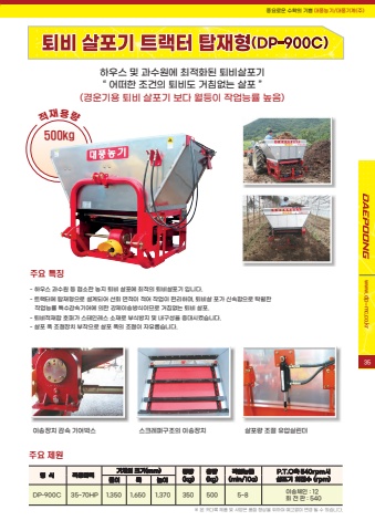 %ud48d%uc694%ub85c%uc6b4 %uc218%ud655%uc758 %uae30%uc068 %ub300%ud48d%ub18d%uae30/%ub300%ud48d%uae30%uacc4(%uc8fc)www.dp-mc.co.kr%u203b %ubcf8 %uce74%ub2e4%ub85d %uc81c%ud488 %ubc0f %uc0ac%uc591%uc740 %ud488%uc9c8 %ud5a5%uc0c1%uc744 %uc704%ud558%uc5ec %uc608%uace0%uc5c6%uc774 %ubcc0%uacbd %ub420 %uc218 %uc788%uc2b5%ub2c8%ub2e4.%uc801%uc7ac%uc6a9%ub7c9500kg%uc8fc%uc694 %ud2b9%uc9d5- %ud558%uc6b0%uc2a4 %uacfc%uc218%uc6d0 %ub4f1 %ud611%uc18c%ud55c %ub18d%uc9c0 %ud1f4%ube44 %uc0b4%ud3ec%uc5d0 %ucd5c%uc801%uc758 %ud1f4%ube44%uc0b4%ud3ec%uae30 %uc785%ub2c8%ub2e4.- %ud2b8%ub799%ud130%uc5d0 %ud0d1%uc7ac%ud615%uc73c%ub85c %uc124%uacc4%ub418%uc5b4 %uc120%ud68c %uba74%uc801%uc774 %uc801%uc5b4 %uc791%uc5c5%uc774 %ud3b8%ub9ac%ud558%uba70, %ud1f4%ube44%uc0b4 %ud3ec%uac00 %uc2e0%uc18d%ud568%uc73c%ub85c %ud0c1%uc6d4%ud55c %uc791%uc5c5%ub2a5%ub960 %ud2b9%uc218%uac10%uc18d%uae30%uc5b4%uc5d0 %uc758%ud55c %uac15%uc81c%uc774%uc1a1%ubc29%uc2dd%uc774%ubbc0%ub85c %uac70%uce68%uc5c6%ub294 %ud1f4%ube44 %uc0b4%ud3ec.- %ud1f4%ube44%uc801%uc7ac%ud568 %ud638%ud37c%uac00 %uc2a4%ud14c%uc778%ub808%uc2a4 %uc18c%uc7ac%ub85c %ubd80%uc2dd%ubc29%uc9c0 %ubc0f %ub0b4%uad6c%uc131%uc744 %uc99d%ub300%uc2dc%ucf30%uc2b5%ub2c8%ub2e4.- %uc0b4%ud3ec %ud3ed %uc870%uc808%uc7a5%uce58 %ubd80%ucc29%uc73c%ub85c %uc0b4%ud3ec %ud3ed%uc758 %uc870%uc808%uc774 %uc790%uc720%ub86d%uc2b5%ub2c8%ub2e4.%ud558%uc6b0%uc2a4 %ubc0f %uacfc%uc218%uc6d0%uc5d0 %ucd5c%uc801%ud654%ub41c %ud1f4%ube44%uc0b4%ud3ec%uae30%u201c %uc5b4%ub5a0%ud55c %uc870%uac74%uc758 %ud1f4%ube44%ub3c4 %uac70%uce68%uc5c6%ub294 %uc0b4%ud3ec %u201d(%uacbd%uc6b4%uae30%uc6a9 %ud1f4%ube44 %uc0b4%ud3ec%uae30 %ubcf4%ub2e4 %uc6d4%ub4f1%uc774 %uc791%uc5c5%ub2a5%ub960 %ub192%uc74c)%uc8fc%uc694 %uc81c%uc6d0%ud615 %uc2dd %uc801%uc6a9%ub9c8%ub825 %uae30%uccb4%uc758 %ud06c%uae30(mm) %uc911%ub7c9(kg)%uc6a9%ub7c9(kg)%uc791%uc5c5%ub2a5%ub960(min/10a)P.T.O%ucd95 540rpm%uc2dc %uae38%uc774 %ud3ed %ub192%uc774 %uc0b4%ud3ec%uae30 %ud68c%uc804%uc218 (rpm)DP-900C 35~70HP 1,350 1,650 1,370 350 500 5~8 %uc774%uc1a1%uccb4%uc778 : 12%ud68c %uc804 %ud310 : 540%uc774%uc1a1%uc7a5%uce58 %uac10%uc18d %uae30%uc5b4%ubc15%uc2a4 %uc2a4%ud06c%ub808%ud37c%uad6c%uc870%uc758 %uc774%uc1a1%uc7a5%uce58 %uc0b4%ud3ec%ub7c9 %uc870%uc808 %uc720%uc555%uc2e4%ub9b0%ub35435
