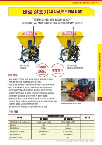 %ud48d%uc694%ub85c%uc6b4 %uc218%ud655%uc758 %uae30%uc068 %ub300%ud48d%ub18d%uae30/%ub300%ud48d%uae30%uacc4(%uc8fc)www.dp-mc.co.kr%uc8fc%uc694 %ud2b9%uc9d5DP-600H(%uc720%uc555%uc2dd)DP-600H2 (%uc720%uc555%uc2dd+%uc2e4%ub9b0%ub354%ubd80%ucc29)%u201c %uade0%uc77c%ud558%uace0 %uc2dc%uc6d0%ud558%uac8c %uc77c%ub418%ub294 %uc0b4%ud3ec%uae30 %u201d%ube44%ub8cc,%uc720%ubc15, %uaddc%uc0b0%uc9c8%ub4f1 %uc785%uc790%ud615 %ube44%ub8cc %uc0b4%ud3ec%uc5d0 %ub531 %ub9de%ub294 %uc0b4%ud3ec%uae30- %ube44%ub8cc %uc720%ucd9c%uad6c%uac00 %ud06c%ubbc0%ub85c %ube44%ub8cc, %uaddc%uc0b0%uc9c8, %uc720%uae30%uc9c8, %uc720%ubc15 %uc0b4%ud3ec%uac00 %uc6a9%uc774%ud568. - %ud22c%uba85%ud638%ud37c %uc7a5%ucc29%uc73c%ub85c %ube44%ub8cc%uc794%ub7c9%uc744 %uc27d%uac8c %uc54c%uc218%uc788%ub2e4.- %ud68c%uc804 %ub0a0%uac1c%ub97c %ube44%ub8cc %uc0b4%ud3ec%uc2dc %uc55e,%uc704%ubc29%ud5a5%uc73c%ub85c %ube44%uc0b0%ub418%uc9c0 %uc54a%ub3c4%ub85d %ud2b9%uc218%uc124%uacc4. - %ud68c%uc804 %ub0a0%uac1c %uc720%ucd9c%uc154%ud2b8 %ubc0f %ubbf9%uc2a4%ud310 %uc2a4%ud14c%uc778%ub808%uc2a4%ub85c %uc81c%uc791%ud558%uc5ec %ubd80%uc2dd%ubc29%uc9c0. - %ud68c%uc804%ud310 %ub098%uc77c%ub860 %ud2b9%uc218%uc218%uc9c0%ub85c %uc81c%uc791%ub428%uc73c%ub85c%uc11c %ubd80%uc2dd %uc5c6%uace0 %ubc18%uc601%uad6c%uc801%uc784.- %ube44%ub8cc%ub7c9 %uc870%uc808%ud310 %ubc0f %uce74%ubc14 %ub4f1 %uac01%ubd80%uc5d0 %uc2a4%ud14c%uc778%ub808%uc2a4%ub85c %uc81c%uc791%ud558%uc5ec %ubd80%uc2dd%ubc29%uc9c0. - %ud638%ud37c%uc640 %ubcf8%uccb4 %ubd84%ub9ac%ud615%uc73c%ub85c %uc124%uacc4%ub418%uc5b4 %uccad%uc18c %ubc0f %uc815%ube44%uac00 %uac04%ud3b8%ud568. - %ube44%ub8cc%ub7c9 %uc870%uc808 %uc190%uc7a1%uc774 %uac01%ub3c4%ub97c %uc790%uc720%ub86d%uac8c %uc870%uc815%ud560 %uc218 %uc788%uc5b4 %uc870%uc791%uc774 %ud3b8%ub9ac%ud568.- %uc720%uc555%ubaa8%ud130 %ub3d9%ub825%uc774 %uae30%uc5b4BOX%ub85c %ud1b5%ud558%uc5ec %ud68c%uc804%ud310 %ubc0f %ubbf9%uc2a4%ub0a0%uc5d0 %uc804%ub2ec%ub428%uc5d0 %ub530%ub77c %uc720%uc555%ubaa8%ud130 %uc720%uc555%uc720 %ub204%uc720%ud604%uc0c1 %uadfc%ubcf8%uc801%uc73c%ub85c %ucc28%ub2e8.- %ub85c%ud0c0%ubca0%uc774%ud130 %uc704%uc5d0 %ube44%ub8cc %uc0b4%ud3ec%uae30(%uc720%uc555%uc2dd) %ud0c8%ubd80%ucc29%uc774 %ud3b8%ub9ac %ud568. %uc8fc%uc694 %uc81c%uc6d0%uad6c %ubd84%ube44%ub8cc%uc0b4%ud3ec%uae30(%uc720%uc555%uc2dd) %ud615%uc2dd%ube44 %uace0DP-600H DP-600H2%uae30%uccb4%ud06c%uae30(%uae38%uc774%u00d7%ud3ed%u00d7%ub192%uc774)(mm) 1,060%u00d71,140%u00d71,030 1,060%u00d71,140%u00d71,030%uc911%ub7c9 (kg) 55 57%ud638%ud37c %uc6a9%ub7c9 (kg) 360kg 360kg%ub3d9%ub825%uc804%ub2ec%ubc29%uc2dd %ubc0f RPM %uc720%uc555%ubaa8%ud130/540 %uc720%uc555%ubaa8%ud130/540%uc0b4%ud3ec%ub7c9 %uc870%uc808%ubc29%uc2dd %ub808%ubc84%uc2dd %uc720%uc555%uc2e4%ub9b0%ub354%uc2dd%uc0b4%ud3ec %ud3ed(%uc88c, %uc6b0)(m) 12 12%u203b %ubcf8 %uce74%ub2e4%ub85d %uc81c%ud488 %ubc0f %uc0ac%uc591%uc740 %ud488%uc9c8 %ud5a5%uc0c1%uc744 %uc704%ud558%uc5ec %uc608%uace0%uc5c6%uc774 %ubcc0%uacbd %ub420 %uc218 %uc788%uc2b5%ub2c8%ub2e4.360kg %ud22c%uba85%ud638%ud37c%uc801%uc7ac%uc6a9%ub7c9%u203b%ub85c%ud130%ubca0%uc774%ud130%uc5d0 %ubd80%ucc29%ub41c %ubaa8%uc2b537