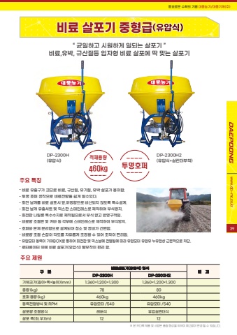 DP-2300H(%uc720%uc555%uc2dd)DP-2300H2(%uc720%uc555%uc2dd+%uc2e4%ub9b0%ub354%ubd80%ucc29)%uc8fc%uc694 %ud2b9%uc9d5%uc8fc%uc694 %uc81c%uc6d0%uad6c %ubd84%ube44%ub8cc%uc0b4%ud3ec%uae30(%uc720%uc555%uc2dd) %ud615%uc2dd%ube44 %uace0DP-2300H DP-2300H2%uae30%uccb4%ud06c%uae30(%uae38%uc774%u00d7%ud3ed%u00d7%ub192%uc774)(mm) 1,360%u00d71,200%u00d71,300 1,360%u00d71,200%u00d71,300%uc911%ub7c9 (kg) 78 80%ud638%ud37c %uc6a9%ub7c9 (kg) 460kg 460kg%ub3d9%ub825%uc804%ub2ec%ubc29%uc2dd %ubc0f RPM %uc720%uc555%ubaa8%ud130 /540 %uc720%uc555%ubaa8%ud130 /540%uc0b4%ud3ec%ub7c9 %uc870%uc808%ubc29%uc2dd %ub808%ubc84%uc2dd %uc720%uc555%uc2e4%ub9b0%ub354%uc2dd%uc0b4%ud3ec %ud3ed(%uc88c, %uc6b0)(m) 12 12%u203b %ubcf8 %uce74%ub2e4%ub85d %uc81c%ud488 %ubc0f %uc0ac%uc591%uc740 %ud488%uc9c8 %ud5a5%uc0c1%uc744 %uc704%ud558%uc5ec %uc608%uace0%uc5c6%uc774 %ubcc0%uacbd %ub420 %uc218 %uc788%uc2b5%ub2c8%ub2e4.%u201c %uade0%uc77c%ud558%uace0 %uc2dc%uc6d0%ud558%uac8c %uc77c%ub418%ub294 %uc0b4%ud3ec%uae30 %u201d%ube44%ub8cc,%uc720%ubc15, %uaddc%uc0b0%uc9c8%ub4f1 %uc785%uc790%ud615 %ube44%ub8cc %uc0b4%ud3ec%uc5d0 %ub531 %ub9de%ub294 %uc0b4%ud3ec%uae30%ud48d%uc694%ub85c%uc6b4 %uc218%ud655%uc758 %uae30%uc068 %ub300%ud48d%ub18d%uae30/%ub300%ud48d%uae30%uacc4(%uc8fc)www.dp-mc.co.kr460kg %ud22c%uba85%ud638%ud37c%uc801%uc7ac%uc6a9%ub7c9- %ube44%ub8cc %uc720%ucd9c%uad6c%uac00 %ud06c%ubbc0%ub85c %ube44%ub8cc, %uaddc%uc0b0%uc9c8, %uc720%uae30%uc9c8, %uc720%ubc15 %uc0b4%ud3ec%uac00 %uc6a9%uc774%ud568. - %ud22c%uba85 %ud638%ud37c %uc7a5%ucc29%uc73c%ub85c %ube44%ub8cc%uc794%ub7c9%uc744 %uc27d%uac8c %uc54c%uc218%uc788%ub2e4.- %ud68c%uc804 %ub0a0%uac1c%ub97c %ube44%ub8cc %uc0b4%ud3ec%uc2dc %uc55e,%uc704%ubc29%ud5a5%uc73c%ub85c %ube44%uc0b0%ub418%uc9c0 %uc54a%ub3c4%ub85d %ud2b9%uc218%uc124%uacc4. - %ud68c%uc804 %ub0a0%uac1c %uc720%ucd9c%uc154%ud2b8 %ubc0f %ubbf9%uc2a4%ud310 %uc2a4%ud14c%uc778%ub808%uc2a4%ub85c %uc81c%uc791%ud558%uc5ec %ubd80%uc2dd%ubc29%uc9c0. - %ud68c%uc804%ud310 %ub098%uc77c%ub860 %ud2b9%uc218%uc218%uc9c0%ub85c %uc81c%uc791%ub428%uc73c%ub85c%uc11c %ubd80%uc2dd %uc5c6%uace0 %ubc18%uc601%uad6c%uc801%uc784.- %ube44%ub8cc%ub7c9 %uc870%uc808%ud310 %ubc0f %uce74%ubc14 %ub4f1 %uac01%ubd80%uc5d0 %uc2a4%ud14c%uc778%ub808%uc2a4%ub85c %uc81c%uc791%ud558%uc5ec %ubd80%uc2dd%ubc29%uc9c0. - %ud638%ud37c%uc640 %ubcf8%uccb4 %ubd84%ub9ac%ud615%uc73c%ub85c %uc124%uacc4%ub418%uc5b4 %uccad%uc18c %ubc0f %uc815%ube44%uac00 %uac04%ud3b8%ud568. - %ube44%ub8cc%ub7c9 %uc870%uc808 %uc190%uc7a1%uc774 %uac01%ub3c4%ub97c %uc790%uc720%ub86d%uac8c %uc870%uc815%ud560 %uc218 %uc788%uc5b4 %uc870%uc791%uc774 %ud3b8%ub9ac%ud568.- %uc720%uc555%ubaa8%ud130 %ub3d9%ub825%uc774 %uae30%uc5b4BOX%ub85c %ud1b5%ud558%uc5ec %ud68c%uc804%ud310 %ubc0f %ubbf9%uc2a4%ub0a0%uc5d0 %uc804%ub2ec%ub428%uc5d0 %ub530%ub77c %uc720%uc555%ubaa8%ud130 %uc720%uc555%uc720 %ub204%uc720%ud604%uc0c1 %uadfc%ubcf8%uc801%uc73c%ub85c %ucc28%ub2e8.- %ub85c%ud0c0%ubca0%uc774%ud130 %uc704%uc5d0 %ube44%ub8cc %uc0b4%ud3ec%uae30(%uc720%uc555%uc2dd) %ud0c8%ubd80%ucc29%uc774 %ud3b8%ub9ac %ud568. 39