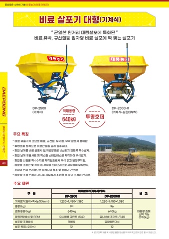 %uc8fc%uc694 %ud2b9%uc9d5- %ube44%ub8cc %uc720%ucd9c%uad6c%uac00 %ud06c%ubbc0%ub85c %ube44%ub8cc, %uaddc%uc0b0%uc9c8, %uc720%uae30%uc9c8, %uc720%ubc15 %uc0b4%ud3ec%uac00 %uc6a9%uc774%ud568. - %ud22c%uba85%ud638%ud37c %uc7a5%ucc29%uc73c%ub85c %ube44%ub8cc%uc794%ub7c9%uc744 %uc27d%uac8c %uc54c%uc218%uc788%ub2e4.- %ud68c%uc804 %ub0a0%uac1c%ub97c %ube44%ub8cc %uc0b4%ud3ec%uc2dc %uc55e,%uc704%ubc29%ud5a5%uc73c%ub85c %ube44%uc0b0%ub418%uc9c0 %uc54a%ub3c4%ub85d %ud2b9%uc218%uc124%uacc4. - %ud68c%uc804 %ub0a0%uac1c %uc720%ucd9c%uc154%ud2b8 %ubc0f %ubbf9%uc2a4%ud310 %uc2a4%ud14c%uc778%ub808%uc2a4%ub85c %uc81c%uc791%ud558%uc5ec %ubd80%uc2dd%ubc29%uc9c0. - %ud68c%uc804%ud310 %ub098%uc77c%ub860 %ud2b9%uc218%uc218%uc9c0%ub85c %uc81c%uc791%ub428%uc73c%ub85c%uc11c %ubd80%uc2dd %uc5c6%uace0 %ubc18%uc601%uad6c%uc801%uc784.- %ube44%ub8cc%ub7c9 %uc870%uc808%ud310 %ubc0f %uce74%ubc14 %ub4f1 %uac01%ubd80%uc5d0 %uc2a4%ud14c%uc778%ub808%uc2a4%ub85c %uc81c%uc791%ud558%uc5ec %ubd80%uc2dd%ubc29%uc9c0. - %ud638%ud37c%uc640 %ubcf8%uccb4 %ubd84%ub9ac%ud615%uc73c%ub85c %uc124%uacc4%ub418%uc5b4 %uccad%uc18c %ubc0f %uc815%ube44%uac00 %uac04%ud3b8%ud568. - %ube44%ub8cc%ub7c9 %uc870%uc808 %uc190%uc7a1%uc774 %uac01%ub3c4%ub97c %uc790%uc720%ub86d%uac8c %uc870%uc815%ud560 %uc218 %uc788%uc5b4 %uc870%uc791%uc774 %ud3b8%ub9ac%ud568. %uc8fc%uc694 %uc81c%uc6d0%uad6c %ubd84%ube44%ub8cc%uc0b4%ud3ec%uae30(%uae30%uacc4%uc2dd) %ud615%uc2dd%ube44 %uace0DP-2500 DP-2500H1%uae30%uccb4%ud06c%uae30(%uae38%uc774%u00d7%ud3ed%u00d7%ub192%uc774)(mm) 1,230%u00d71,450%u00d71,380 1,230%u00d71,450%u00d71,380%uc911%ub7c9 (kg) 94 96%ud638%ud37c %uc6a9%ub7c9 (kg) 640kg 640kg%ub3d9%ub825%uc804%ub2ec%ubc29%uc2dd %ubc0f RPM %uc720%ub2c8%ubc84%uc15c %uc8e0%uc778%ud2b8 /540 %uc720%ub2c8%ubc84%uc15c %uc8e0%uc778%ud2b8 /540%uc0b4%ud3ec%ub7c9 %uc870%uc808%ubc29%uc2dd %ub808%ubc84%uc2dd %uc720%uc555%uc2e4%ub9b0%ub354%uc2dd%uc0b4%ud3ec %ud3ed(%uc88c, %uc6b0)(m) 12 12%u203b %ubcf8 %uce74%ub2e4%ub85d %uc81c%ud488 %ubc0f %uc0ac%uc591%uc740 %ud488%uc9c8 %ud5a5%uc0c1%uc744 %uc704%ud558%uc5ec %uc608%uace0%uc5c6%uc774 %ubcc0%uacbd %ub420 %uc218 %uc788%uc2b5%ub2c8%ub2e4.%u201c %uade0%uc77c%ud55c %uc6d0%uac70%ub9ac %ub300%ub7c9%uc0b4%ud3ec%uc5d0 %ud2b9%ud654%ub41c %u201d%ube44%ub8cc,%uc720%ubc15, %uaddc%uc0b0%uc9c8%ub4f1 %uc785%uc790%ud615 %ube44%ub8cc %uc0b4%ud3ec%uc5d0 %ub531 %ub9de%ub294 %uc0b4%ud3ec%uae30%ud48d%uc694%ub85c%uc6b4 %uc218%ud655%uc758 %uae30%uc068 %ub300%ud48d%ub18d%uae30/%ub300%ud48d%uae30%uacc4(%uc8fc)%uc77c%ub418%ub294%uc791%uc5c5%uae30%ub294%ub2e4%ub974%ub2e4DP-2500(%uae30%uacc4%uc2dd)DP-2500H1 (%uae30%uacc4%uc2dd+%uc2e4%ub9b0%ub354%ubd80%ucc29)640kg %ud22c%uba85%ud638%ud37c%uc801%uc7ac%uc6a9%ub7c9%ub300%uc6a9%ub7c9 %ud638%ud37c %uc120%ud0dd %uac00%ub2a5(740kg)40